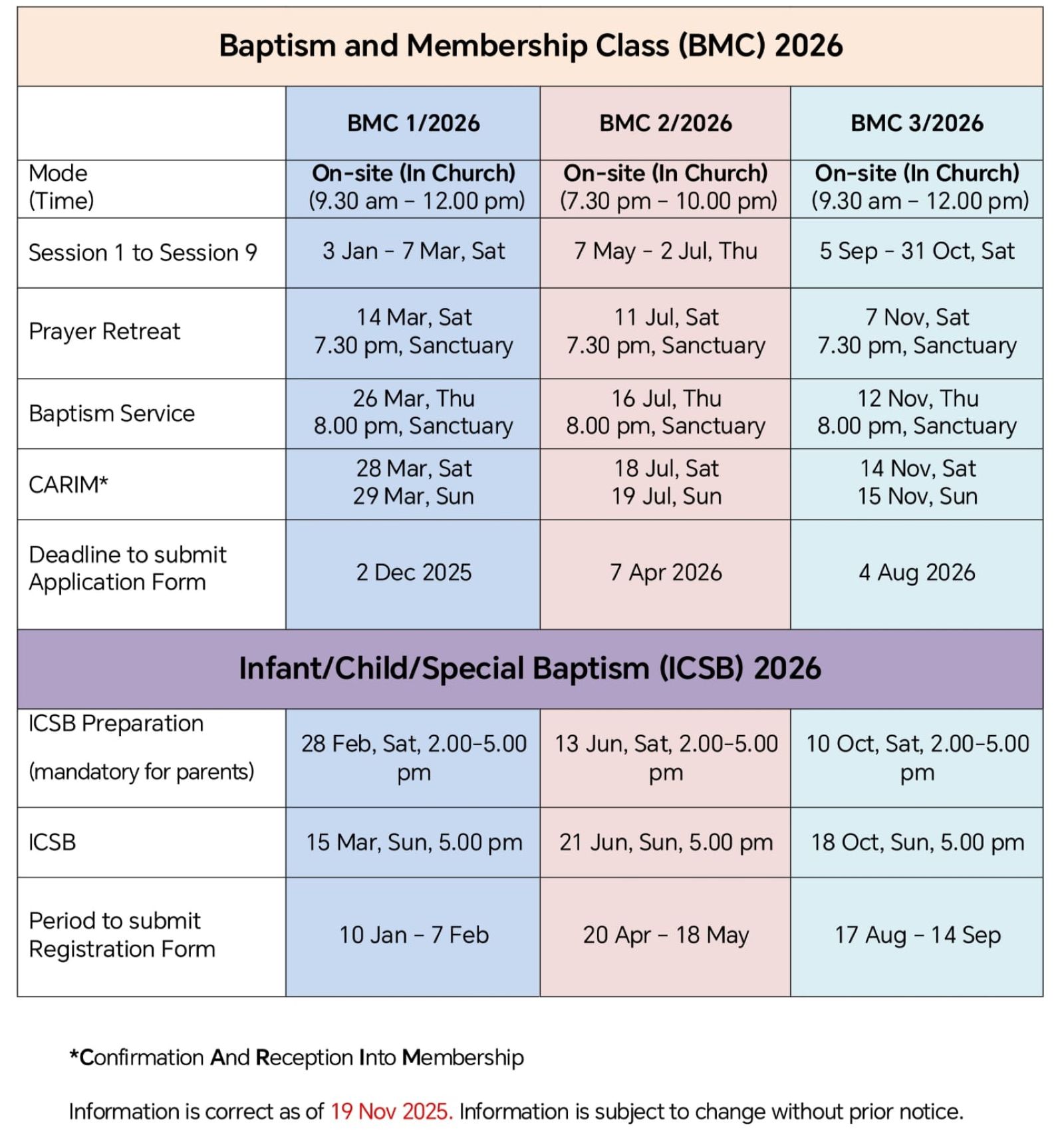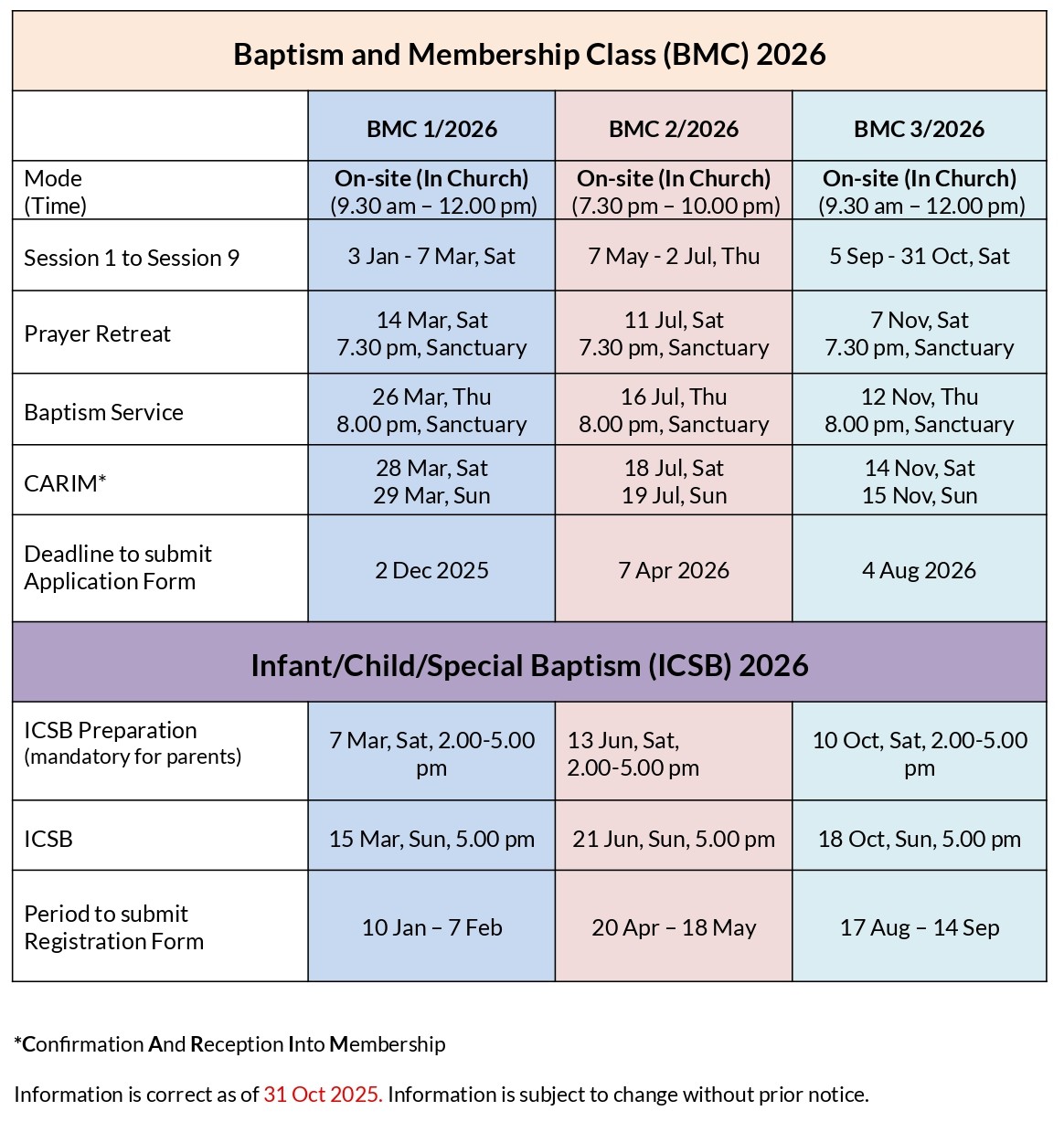 Check out the Baptisms and BMC Schedule below. Please note that course details can be subjected to change and registered candidates will be notified accordingly.